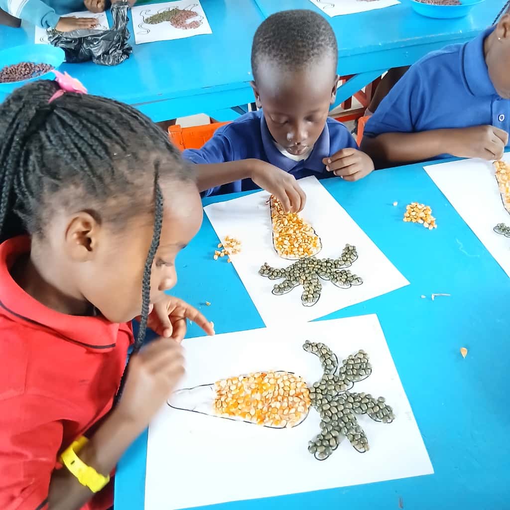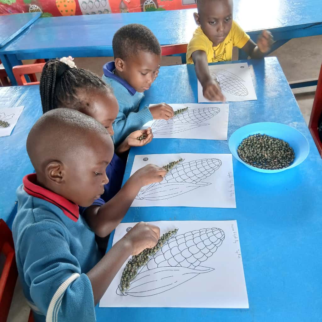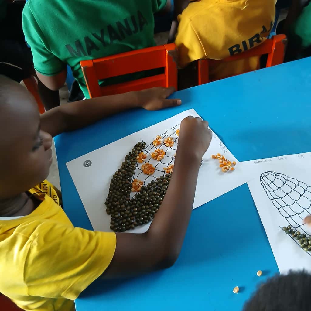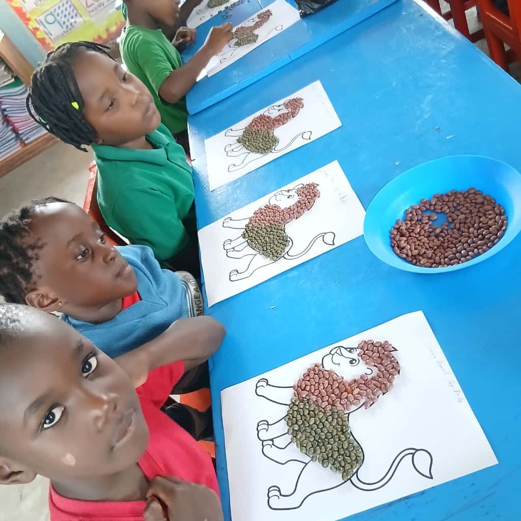 Using seeds of different shapes, sizes, and colours—like millet, beans, and maize—the children carefully arranged each piece to form bodies, wings, patterns, and more. Then, with soft, colourful wool, they added features like feathers, fur, tails, and even grass to complete their masterpieces.